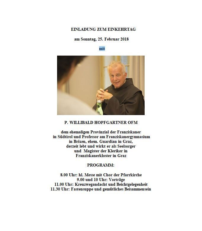 EINLADUNG ZUM EINKEHRTAG am Sonntag, 25. Februar 2018
