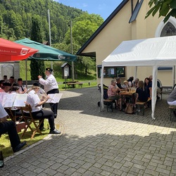 Pater Thomas feierte mit uns das Hochamt um 10:30 Uhr. Geige, Orgel und Trompeten brachten uns in feierliche Stimmung. Nach dem Gottesdienst spielte die Bergknappenkapelle Unterlaussa. Es gab alles von Schnitzel bis Schilcher Charmant.